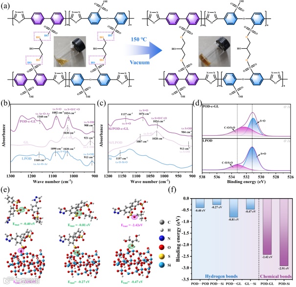 图2. (a) 由LPOD与GL缩合反应形成的交联POD-c-GL粘结剂的示意图。(b) LPOD、GL和POD-c-GL的FTIR光谱。(c) Si、Si/LPOD和Si/POD-c-GL复合材料的FTIR光谱。(d) LPOD和POD-c-GL粘结剂的O 1s XPS光谱。(e) 界面化学键与氢键模拟。(f) 相应的键能值。