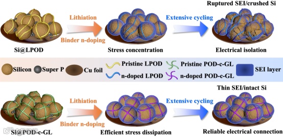 图1. Si@LPOD和Si@POD-c-GL电极在循环过程中的形态演变示意图