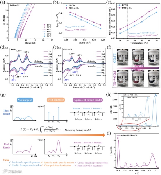 图3. (a) 不同温度下POD-c-GL的EIS测试。(b) Li+通过LPOD和POD-c-GL薄膜的活化能。(c) 不同温度下LPOD和POD-c-GL薄膜的离子导电性。(d) LPOD薄膜的CV曲线和(e) POD-c-GL薄膜的CV曲线。(f) 在n掺杂和去掺杂过程中的LPOD和POD-c-GL薄膜的相应颜色变化。(g) EIS图谱、DRT曲线和等效电路模型之间的关系。(h) 未掺杂POD-c-GL的DRT曲线和(i) n掺杂POD-c-GL的DRT曲线。