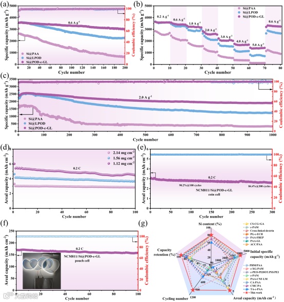 图4. 各种硅电极的电化学性能评估。(a) 循环性能(在0.6 A g-1下测试),(b) 倍率性能,(c) 长按性能(在2.0 A g-1下测试) of Si@PAA、Si@LPOD和Si@POD-c-GL电极。(d) 不同质量负载下Si@POD-c-GL的面积容量。NCM811//Si@POD-c-GL的电化学性能 (e) 全扣式电池和(f) 全软包电池(插图:NCM811//Si@POD-c-GL软包电池点亮灯带)。(g) 与之前研究中各种先进交联粘结剂的硅基电池电化学性能比较。