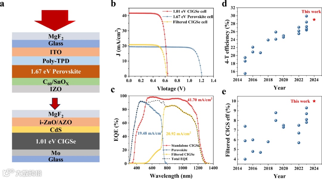 将1.01 eV带隙、效率为20.37%的CIGS电池与1.67 eV带隙、效率为19.02%的半透明钙钛矿太阳能电池组装成四端叠层电池。通过引入光学匹配层(index matching)有效解决机械堆叠界面光学损耗问题,最终实现29.02%的四端叠层效率,其中CIGS底电池贡献了创纪录的10%的绝对效率。