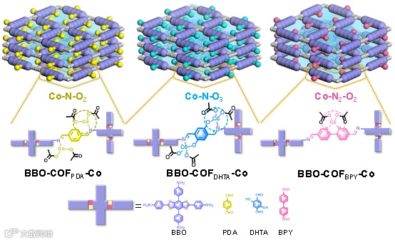 供电子的4,4',4'',4'''-(benzo[1,2-d:4,5-d']bis(oxazole)-2,4,6,8-tetrayl)tetraaniline (BBO)构建单元分别与对苯二甲醛(PDA),2,5-二羟基对苯二甲醛(DHTA),2,2'-联吡啶-5,5'-二甲醛(BPY),通过希夫碱反应合成具有D-A结构的COFs,分别命名为BBO-COFPDA、BBO-COFDHTA和BBO-COFBPY。通过后修饰法,将Co原子锚定于BBO-COFPDA、BBO-COFDHTA和BBO-COFBPY之中,得到具有不同配位环境的BBO-COFPDA-Co、BBO-COFDHTA-Co和BBO-COFBPY-Co,其配位构型分别对应于Co‒N‒O2、Co‒N‒O3和Co‒N2‒O2。BBO-COFPDA-Co、BBO-COFDHTA-Co和BBO-COFBPY-Co光催化CO2还原的CO产率分别为5193.27、8876.85和10552.15 μmol g–1 h–1,分别高于BBO-COFPDA (1786.12 μmol g–1 h–1)、BBO-COFDHTA (3170.30 μmol g–1 h–1)和BBO-COFBPY (5024.87 μmol g–1 h–1)。