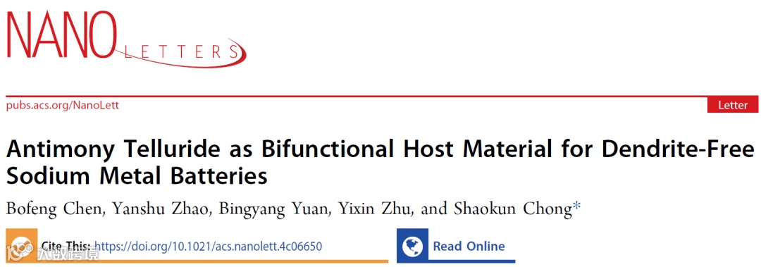 基于此,西北工业大学崇少坤课题组在国际知名期刊Nano Letters上发表题为“Antimony Telluride as Bifunctional Host Material for Dendrite-Free Sodium Metal Batteries”的观点文章。该文章分析了转换-合金型宿主材料在抑制枝晶生长与稳定钠金属负极方面的协同作用,为构建无枝晶的钠金属负极提出了新的见解。