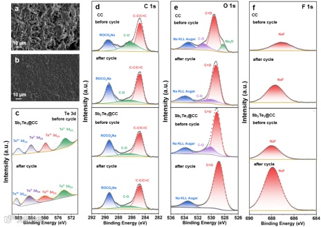 图4. 50个周期后a)Na@CC和b)Na@Sb2Te3@CC的FESEM图像;循环前后Na@CC和Na@Sb2Te3@CC的SEI层中c)Te 3d、d)C 1s、e)O 1s和f)F 1s 的XPS光谱。