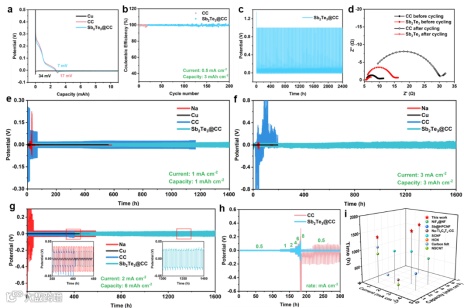 图3. a)CC和Sb2Te3@CC上的成核过电位,(b)库仑效率以及(c)对应的充放电曲线;(d)循环前和50次循环后Na@CC和Na@Sb2Te3@CC 的EIS图;对称电池在不同电流密度和容量下的循环稳定性:e)1 mA cm-2、1 mAh cm-2,f)3 mA cm-2、3 mAh cm-2,g)2 mA cm-2、6 mAh cm-2;h)Na@CC和Na@Sb2Te3@CC的倍率性能;i)这项工作中对称电池的循环寿命与其他研究的比较。