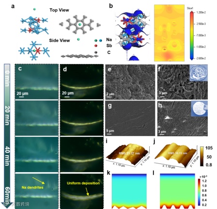 图2. a)Na离子在 Na3Sb和CC上的吸附能模型;b) Na离子吸附在Na3Sb上的差分电荷密度和相应的二维切片图;Na在c)CC和d)Sb2Te3@CC上沉积的原位光学照片;电镀容量为e)5和f)10 mAh cm-2的CC的FESEM 图像;电镀容量为g)5和 h)10 mAh cm-2时Sb2Te3@CC的FESEM图像;i)CC和j)Sb2Te3@CC的AFM图像;k)CC和l)Sb2Te3@CC的COMSOL仿真。