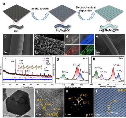 图1. a)Na@Sb2Te3@CC的合成示意图;b)CC和c)Sb2Te3@CC的FESEM图像;d)Sb2Te3@CC的EDS面扫图像;e)沉积面容量为10 mAh cm-2的Na@Sb2Te3@CC负极的FESEM图像;f)Sb2Te3的Rietveld精修XRD图谱;g)Sb 3d 和 h)Te 3d 的XPS光谱;Sb2Te3的i)TEM 图像,j)HRTEM 图像,k)FFT图谱和l) HAADF-STEM图像。