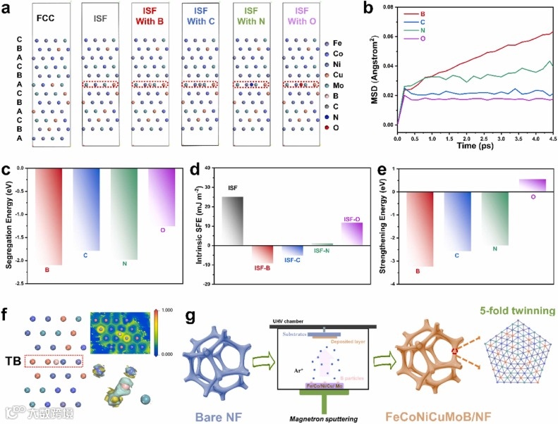 结合DFT计算和MD模拟方法,以FeCoNiCuMo高熵合金为研究对象,通过添加不同种类的间隙原子(B、C、N和O),研究不同间隙原子的偏析行为及其对本征层错能的影响。结果表明B原子掺杂可以降低体系的层错能并强化晶界,有望实现多重孪晶结构高熵合金的可控制备。实验上,我们通过磁控溅射方法制备了成分均匀的FeCoNiCuMoB和FeCoNiCuMo高熵合金薄膜。