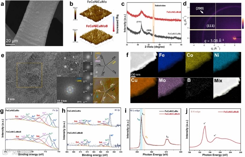 SEM结果显示,高熵合金薄膜致密均匀的沉积在碳布基底上,没有明显的结构缺陷。XRD的结果表明制备的FeCoNiCuMoB及FeCoNiCuMo高熵合金薄膜均为单一的FCC结构,且结晶性良好。TEM结果表表明,B掺杂的FeCoNiCuMoB高熵合金薄膜中存在显著的五重孪晶结构。EDS-Mapping显示所有金属元素都均匀分布于薄膜之中。XAS与XPS结果表明,B掺杂有效调节了各金属元素的化学特性。
