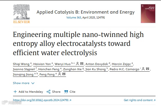 Shiqi Wang, Haixian Yan, Wenyi Huo, Anton Davydok, Marcin Zając, Joanna Stępień, Hanchen Feng, Zonghan Xie, Jian Ku Shang, Pedro H. C. Camargo, Jianqing Jiang, Feng Fang,Engineering multiple nano-twinned high entropy alloy electrocatalysts toward efficient water electrolysis. Applied Catalysis B: Environment and Energy 363 (2025) 124791.