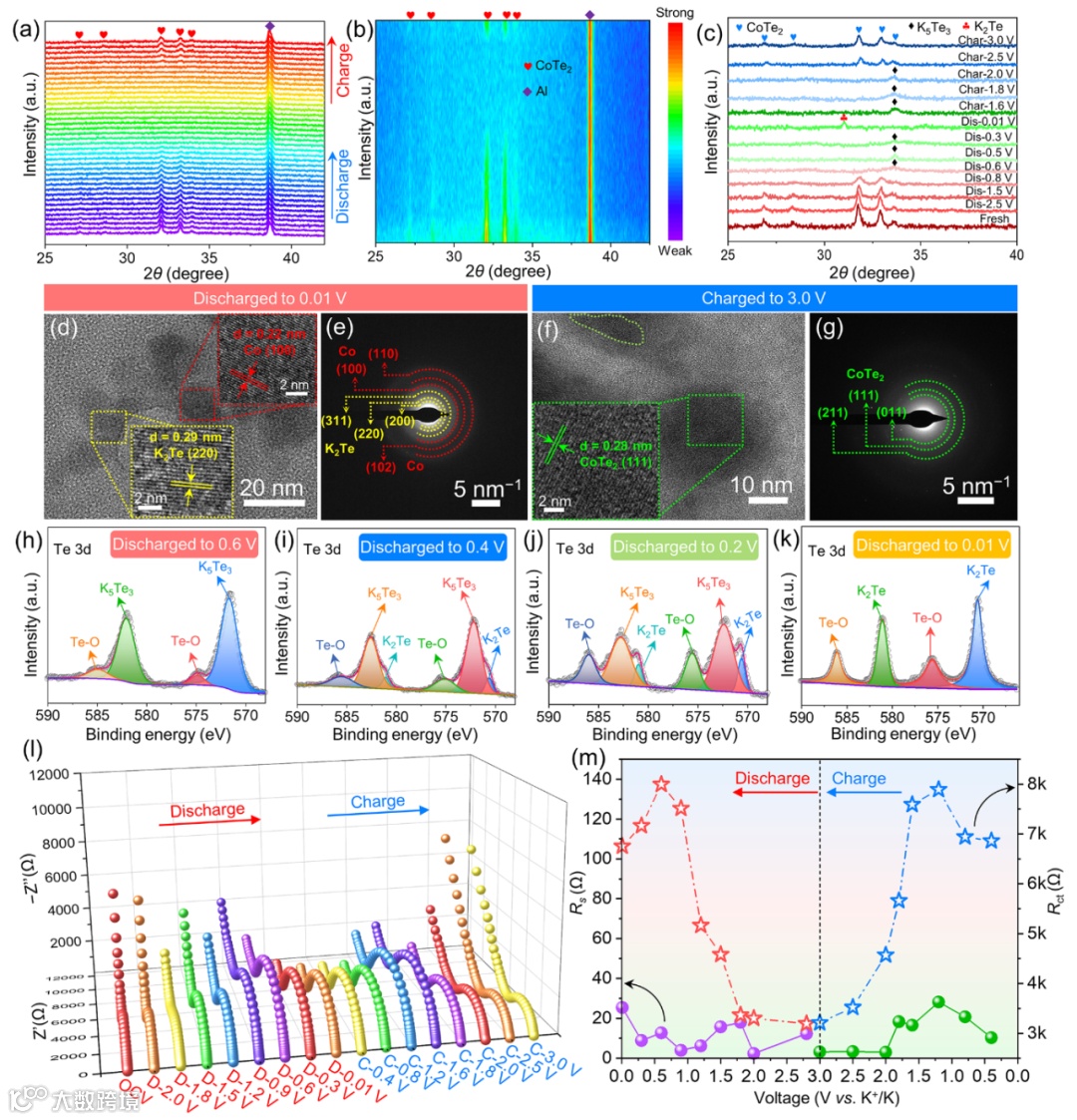 图5. (a) N-CoTe2/LTTC电极在首次循环过程中的原位XRD图谱,(b)相应的等高线图像和 (c)非原位XRD图谱;(d、f)分别为N-CoTe2/LTTC电极在0.05 A g–1电流密度下放电至0.1 V和充电至3.0 V后的TEM图像,(e,g) 分别为对应的HRTEM图像。N-CoTe2/LTTC电极在不同放电状态下Te 3d的XPS图谱:(h) 0.6 V,(i) 0.4 V,(j) 0.2 V,以及(k) 0.01 V;(l) N-CoTe2/LTTC电极在首次循环过程中不同电位下的原位EIS曲线,以及(m)相应的Rs和Rct值。