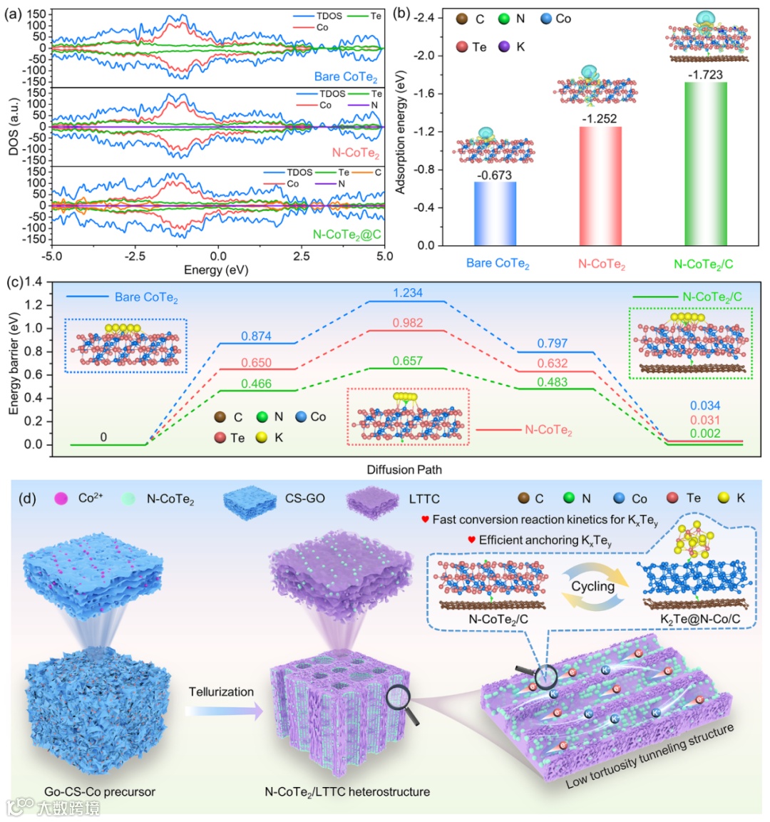 图2. (a) bare CoTe2, N-CoTe2和N-CoTe2/C的态密度;(b) K+在bare CoTe2, N-CoTe2 和N-CoTe2/C上的吸附能(插图:相应电子密度差的侧视图);(c) Bare CoTe2, N-CoTe2 和N-CoTe2/C的能垒比较(插图:K+在bare CoTe2, N-CoTe2和N-CoTe2/C上的扩散路径侧视图);(d) N-CoTe2/LTTC异质结构的合成示意图。