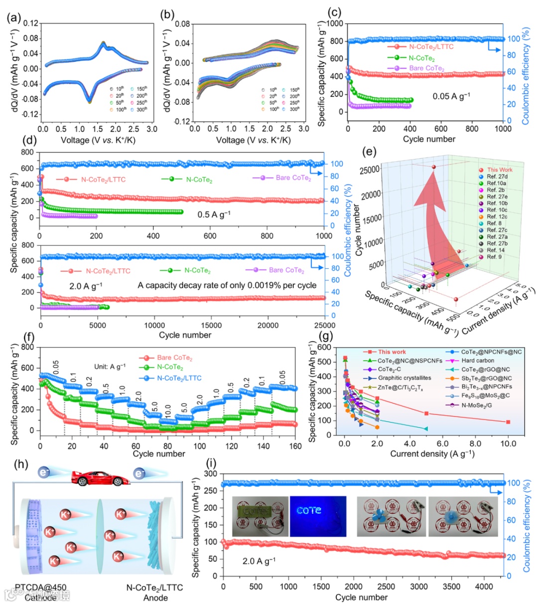 图4. (a) N-CoTe2/LTTC和 (b) N-CoTe2在不同充放电曲线下的dQ/dV曲线;(c) N-CoTe2/LTTC在0.05 A g–1电流密度下的循环性能;(d) N-CoTe2/LTTC、N-CoTe2和bare CoTe2电极在0.5 A g–1和 2.0 A g–1电流密度下的循环性能;(e) N-CoTe2/LTTC负极与先前报道的碲基负极材料的循环性能比较图;(f) N-CoTe2/LTTC、N-CoTe2和bare CoTe2电极的倍率性能;(g) N-CoTe2/LTTC负极与先前报道的钾离子电池中碲基负极材料的倍率性能比较图;(h) N-CoTe2/LTTC//PTCDA@450全电池的示意图;(i) N-CoTe2/LTTC//PTCDA@450全电池在2.0 A g–1电流密度下的循环性能(插图:由该全电池供电的发光二极管阵列和微型风车的照片)。