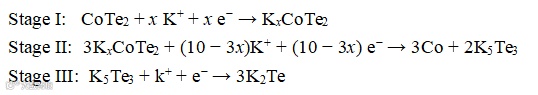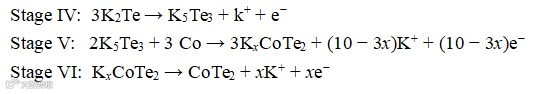 为了深入分析N-CoTe2/LTTC的储钾机制,采用In-situ XRD/In-situ Raman/In-situ EIS和ex-situ XRD/ex-situ XPS/ex-situ TEM表征手段进行分析。基于多种原位和非原位测量结果和CV曲线,N-CoTe2/LTTC电极遵循可逆的插层-转化反应机理,具体反应机理可分为6阶段: