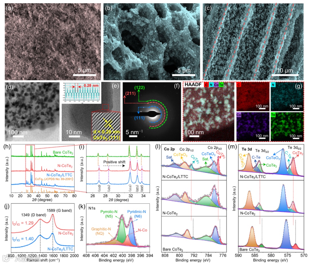 图3. (a) Go-CS-Co前驱体的SEM图像,(b) N-CoTe2/LTTC的SEM图像以及(c) N-CoTe2/LTTC的横截面SEM图像;N-CoTe2/LTTC的d) TEM图像,(e) HTEM图像(插图为晶格间距),(f) SAED以及(g)元素映射图像;(h) X射线衍射图谱,(i) (0 1 1)、(1 0 1)、(1 1 1)、(1 2 0)和(2 0 0)衍射峰的放大图像以及(j) bare CoTe2, N-CoTe2 和N-CoTe2/C的拉曼光谱;(k) N-CoTe2/C的N 1s XPS高分辨率光谱图,bare CoTe2, N-CoTe2 和N-CoTe2/C的(l) Co 2p和 (m) Te 3d 的XPS高分辨率光谱图。