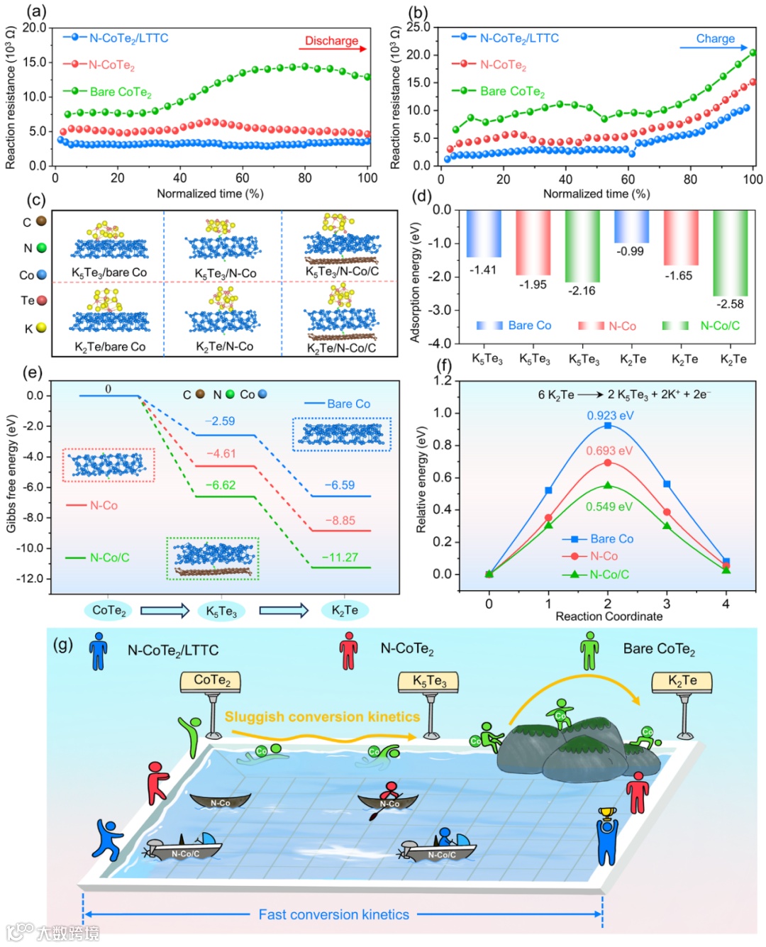 图6. 从GITT测量中计算得到的N-CoTe2/LTTC电极在(a) 放电过程中的反应电阻和(b) 充电过程中的反应电阻;(c)转化产物KxTey (包括K5Te3和K2Te) 吸附在bare Co、N-Co和N-Co/C基底上的优化结构和(d) 相应的吸附能数值;(e) KxTey在bare Co、N-Co和N-Co/C基底上转化的吉布斯自由能变化(插图:bare Co、N-Co和N-Co/C基底的侧视结构);(f) K2Te在bare Co、N-Co和N-Co/C基底上的分解能垒;(g) N-CoTe2/LTTC中由N-Co键和异质结构所导致的转化动力学增强示意图。