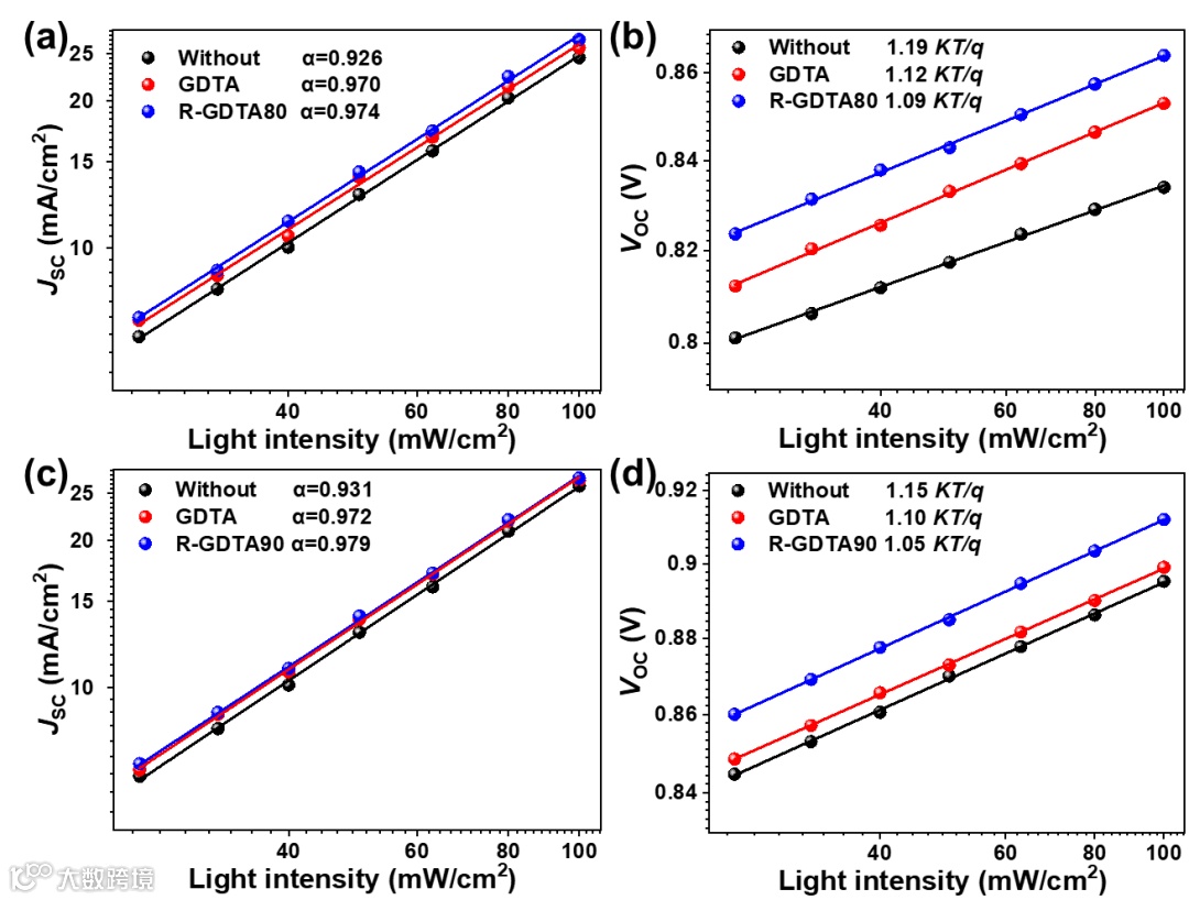 图3基于PM6:Y6与D18-Cl:L8-BO体系OSCs的光电流(a和c)与光电压(b和d)特性