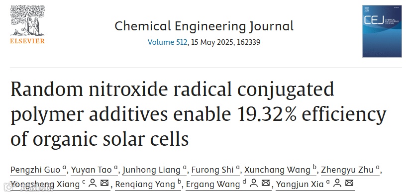 相关研究成果最新发表于国际Top期刊《Chemical Engineering Journal》上,题为“Random nitroxide radical conjugated polymer additives enable 19.32% efficiency of organic solar cells”。文章由兰州交通大学国家绿色镀膜技术与装备工程研究中心郭鹏智博士为第一作者完成,兰州交通大学夏养君教授、中国石油兰州化工研究中心向永生教授和查尔姆斯理工大学王二刚教授为共同通讯作者。