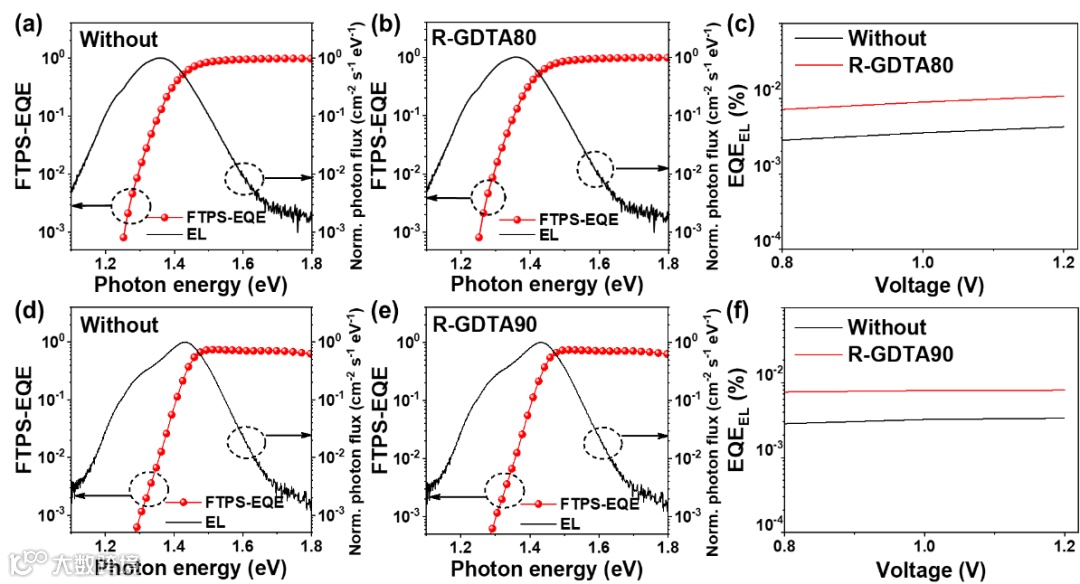 图2. 基于PM6:Y6和D18-Cl:L8-BO体系OSCs器件的EL, FTPS-EQE以及EQEEL