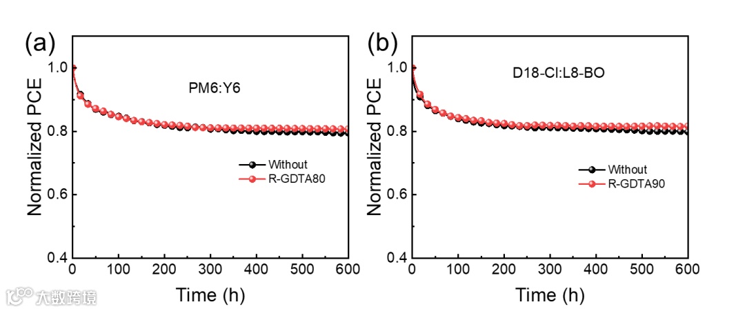 图4基于PM6:Y6与D18-Cl:L8-BO体系加入R-RCP的OSCs器件的稳定性