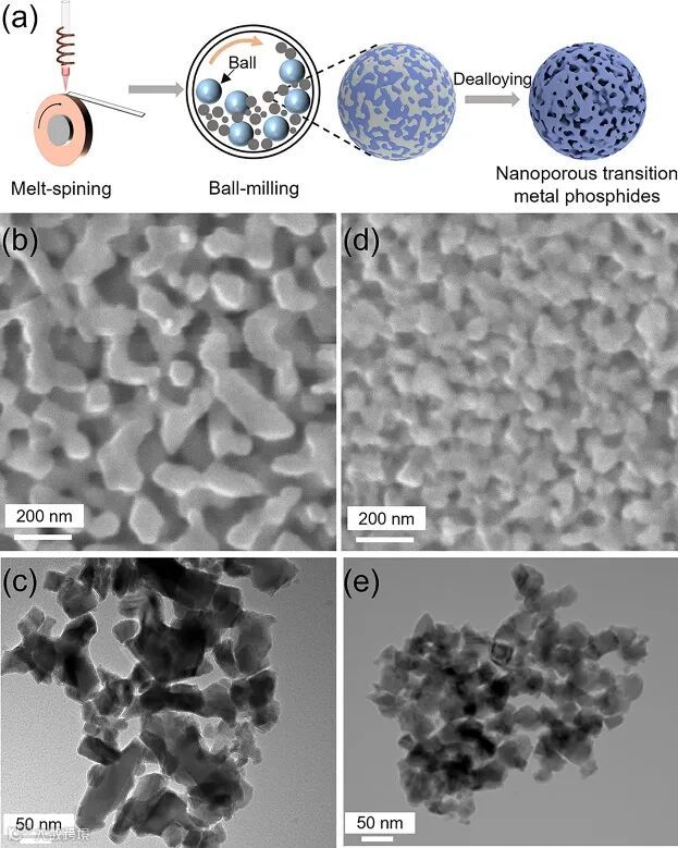 图1. 球磨与脱合金协同制备纳米多孔 (CoFe)2P催化剂示意图及其微观结构表征