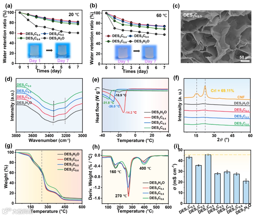 通过在PAA/DES凝胶体系中引入天然来源的纤维素纳米纤维(CNF),在分子层面建立了丰富的氢键和动态网络结构,显著增强了凝胶的结构稳定性与离子迁移能力;CNF作为刚性纳米骨架,不仅提升了凝胶的力学强度,还通过其表面的羟基与PAA和DES中的功能基团形成动态氢键,有效促进了应力分散和离子传导通道的形成;优化后的离子凝胶电解质在室温下展现出高达45.5 mS cm⁻¹的离子电导率,并在−20 °C至60 °C的宽温度范围内维持稳定,为柔性器件提供了稳定的电化学支撑。