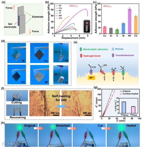 该凝胶材料展现出出色的界面黏附性能,尤其在金属片、碳布、泡沫镍等多种基底上均能牢固附着,最大黏附强度达到83.1 kPa,有效避免了电极与电解质界面脱层问题;同时,凝胶中引入的大量动态氢键与离子相互作用赋予其优异的自修复特性,在无外力作用下于室温自愈合24小时后,即可恢复结构完整性与良好的离子传导性(离子电导率恢复至原始状态的90%以上),显著提升了器件可靠性与使用寿命。