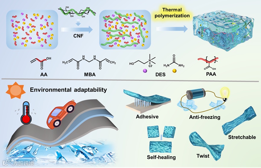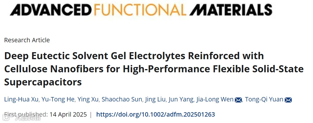 基于此,北京林业大学文甲龙教授和袁同琦教授在国际知名期刊Advanced Functional Materials上发表题为“Deep Eutectic Solvent Gel Electrolytes Reinforced with Cellulose Nanofibers for High-Performance Flexible Solid-State Supercapacitors”的研究论文。该文章提出并系统验证了一种“纤维素纳米纤维(CNF)增强的聚丙烯酸-低共熔溶剂(PAA/DES)”离子凝胶体系,构建了具有宽温度范围、高离子电导率、优异机械韧性、自修复及强黏附性能的多功能型凝胶电解质。