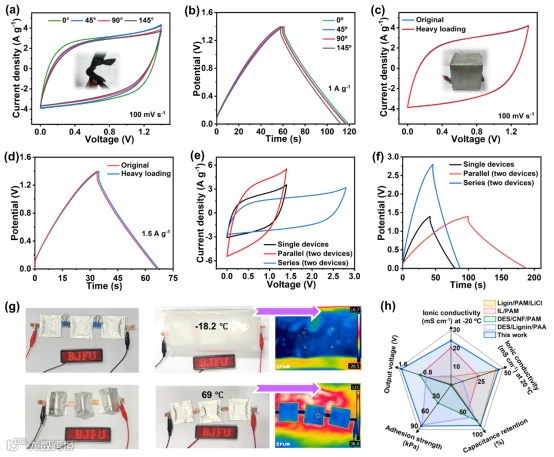 图6. 基于离子凝胶组装的柔性超级电容器的实际应用性能。