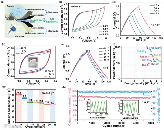 以PAA/DES/CNF离子凝胶为电解质构建的柔性固态超级电容器,在1 A g⁻¹电流密度下实现了94.4 F g⁻¹的高比电容,同时展现出优异的循环稳定性,5000次充放电循环后容量保持率仍达90%以上;器件可在严寒(−20 ℃)、高温(60 ℃)以及多种机械变形(压缩和弯曲)状态下稳定运行,表现出优异的环境适应性与力学柔韧性;在串并联拓展后,可稳定点亮LED负载,进一步验证了其在柔性储能系统中的实际潜力。