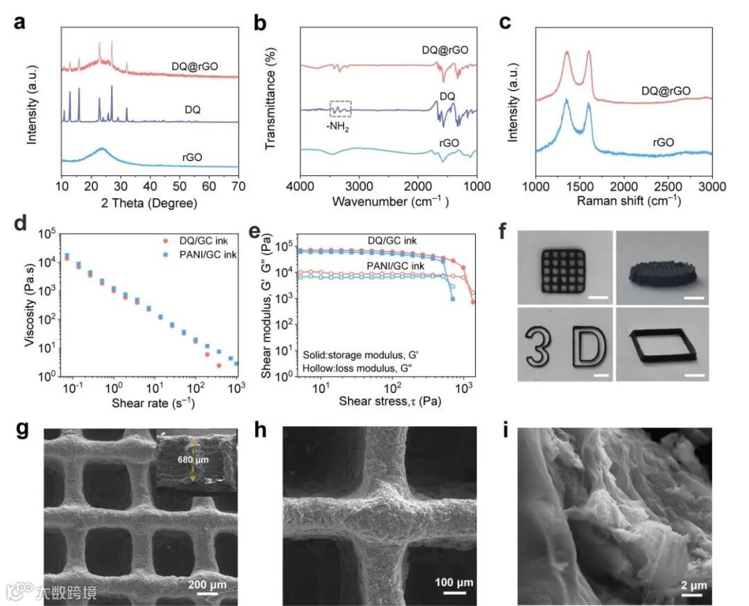 图2. (a) XRD图谱 (b) FTIR和 (c) Raman光谱;(d, e)墨水的流变性质;(f) 不同结构的3D打印图案的照片;(g-i) 3DP DQ/GC电极的SEM图像