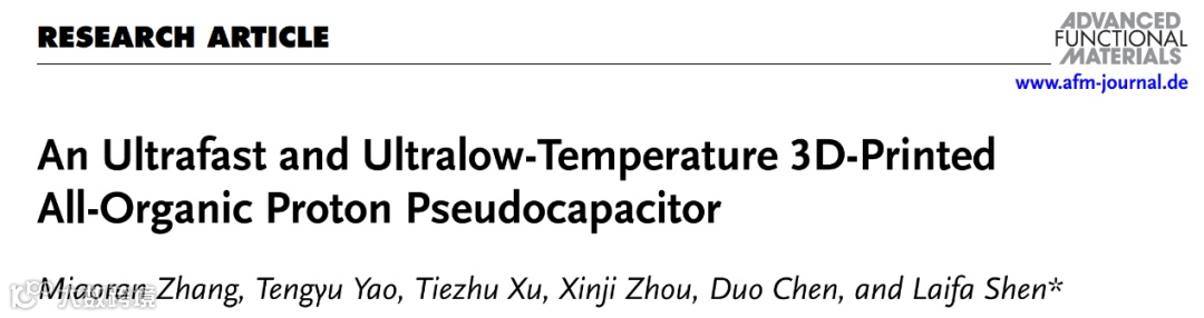 Miaoran Zhang, Tengyu Yao, Tiezhu Xu, Xinji Zhou, Duo Chen, Laifa Shen*. An Ultrafast and Ultralow-Temperature 3D-Printed All-Organic Proton Pseudocapacitor. Adv. Funct. Mater. 2024, 2413436.