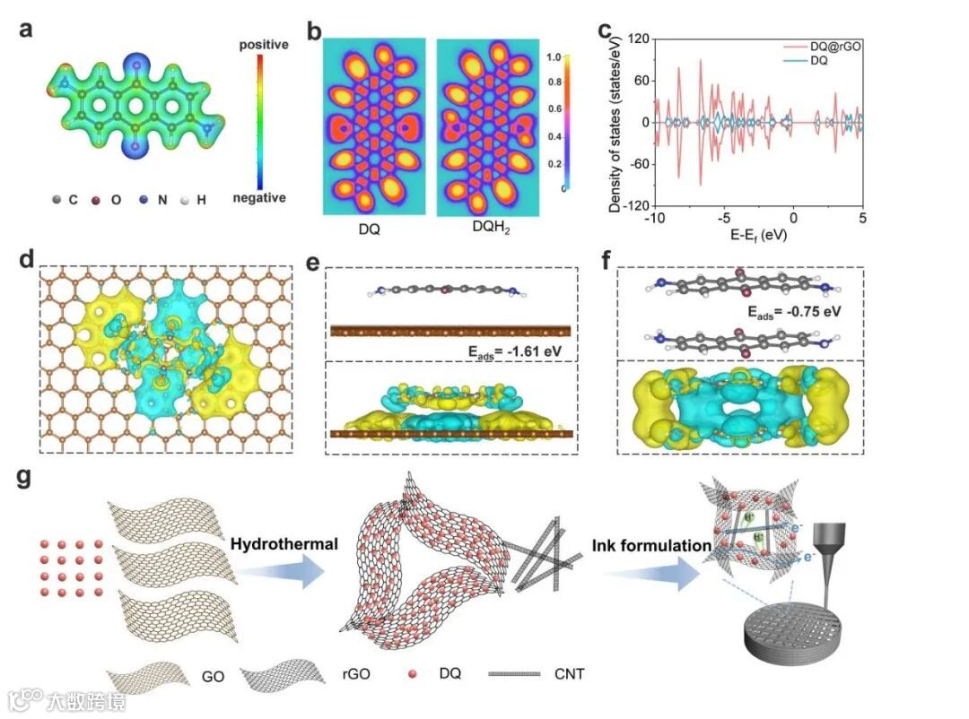 图1. (a) DQ分子的MESP和 (b) ELF图;(c) DQ和DQ@rGO的态密度;(d, e) DQ@rGO和 (f) DQ分子的吸附能和电荷密度;(g) 3D打印电极制备过程