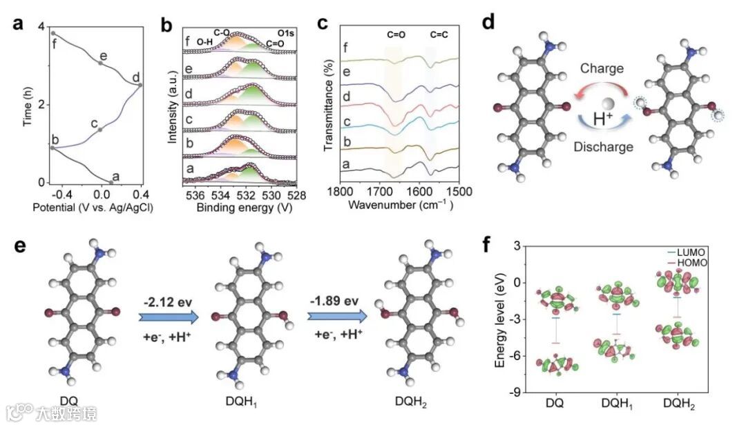 图3. DQ/GC 的(a) 充放电曲线,(b)非原位O 1s XPS和 (c) FTIR谱图;(d) 示意图;(e) DQ与不同数量H+结合的结合能;(f)分子轨道能级图