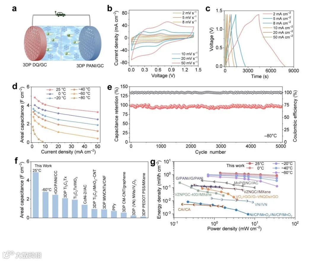得益于电极的三维跨尺度结构,3D打印全有机质子赝电容器在2 mA cm−2下可实现高达4.87 F cm−2的面积比电容,当电流密度增至50 mA cm−2,面积比电容依然保持在 3.29 F cm−2。即使在−60℃下,3D打印质子赝电容器也能实现0.76 mWh cm−2的能量密度,且优于许多高质量负载的超级电容器在室温下的性能。当温度降至−80°C时,该电容器经历5,000次循环后仍能稳定运行,证实了其在极端环境中的应用潜力。
