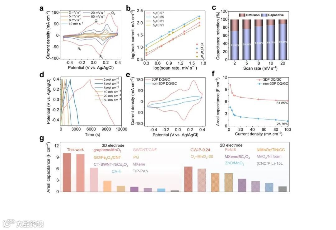 图4. 3DP DQ/GC电极 (a) CV曲线, (b) 氧化还原峰的峰电流和扫描速率的幂律关系;(c)电容贡献占比;(d) GCD曲线;(e) 3DP DQ/GC和非3DP DQ/GC电极在50 mV/s下的CV曲线;(f) 3DP DQ/GC电极与非3DP DQ/GC电极面积电容对比;(g) 3DP DQ/GC与先前报道的高质量负载电极面积电容的对比