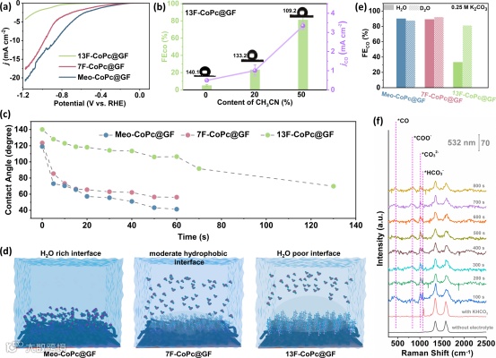 研究团队联合同位素标记实验、原位接触角动态监测和原位拉曼光谱等多种表征技术,系统揭示了疏水微环境在CO2电还原过程中的多重协同优化机制:(1)在界面反应层面,适度疏水的固液界面构建了高效的电子迁移-物质传输双通道,显著提升了反应物分子的可及性;(2)在反应选择方面,精准调控的疏水微环境通过优化界面水分子排布,形成弱排斥水层,有效抑制了析氢副反应的竞争;(3)在产物吸脱附方面,独特疏水界面促进了CO2的迁移吸附和CO产物的快速脱附。