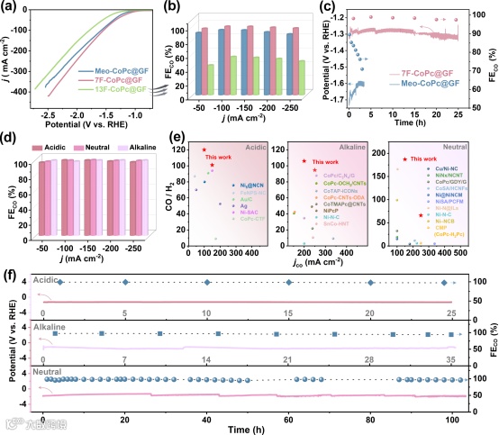 在酸性电解环境中,经适度疏水微环境修饰的7F-CoPc@GF催化电极展现出卓越的电催化性能,电流密度可达-420 mA cm-2,连续运行25小时活性无明显衰减,其耐久性显著优于不含疏水微环境的对照样品Meo-CoPc@GF(三小时既衰减至初始性能的72%)(图2)。值得注意的是,该电极在酸性、碱性、中性条件下均能维持90%以上的CO法拉第效率,这一特性得益于其独特的"分子疏水盾"结构设计。这种兼具高活性、高稳定性和宽pH适应性的分子工程策略,为发展工业化CO2电解技术提供了新的材料设计思路。