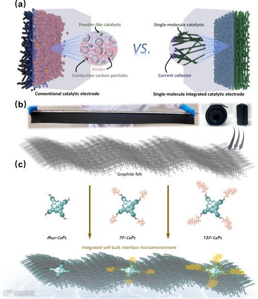针对传统疏水电催化剂在酸性电解液中普遍存在的活性衰减快、三相界面传质受限等关键科学问题,研究团队创新性地提出了"分子水平微环境工程"设计理念。通过精准分子设计,成功合成了一类具有全氟烷基链修饰的钴酞菁分子(7F-CoPc),并利用液相自适应锚定策略,实现了从疏水微环境分子结构设计到大尺寸集成催化电极的跨尺度构建。