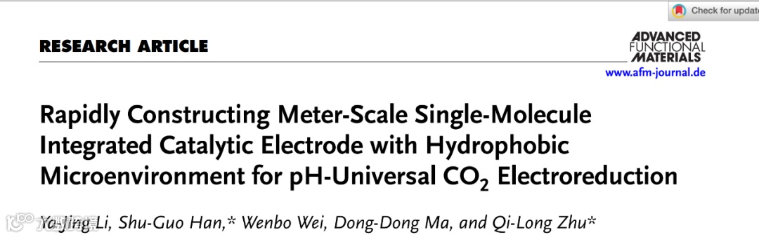 Rapidly Constructing Meter-Scale Single-Molecule Integrated Catalytic Electrode with Hydrophobic Microenvironment for pH-Universal CO2 Electroreduction, Adv. Funct. Mater. 2025, 35, 2501936.