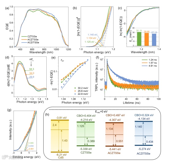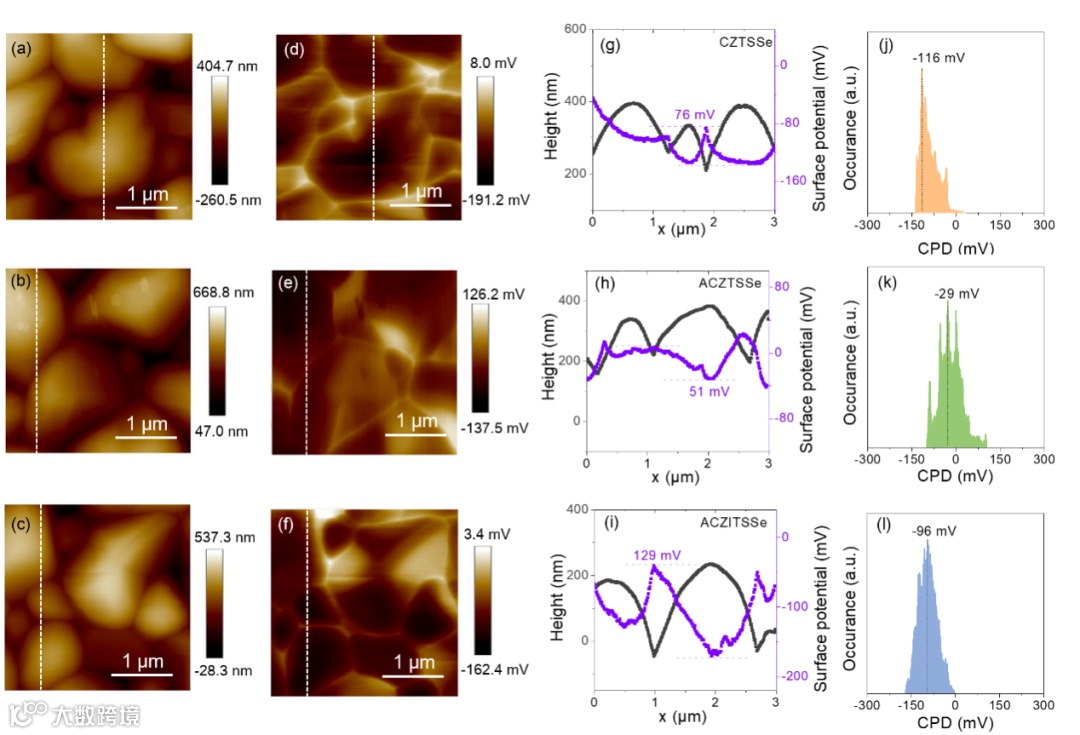 AFM和KPFM数据表明所有样品的晶界都显示出正电位变化,双阳离子取代使GB电位值从51 mV增加到129 mV,这意味着ACZITSSe样品具有更强的载流子分离能力。CZTSSe样品和ACZTSSe样品的平均接触电势差(CPD)分别为-29和-116mV,较低的CPD值对应较低的费米能级。样品ACZTSSe表面的平均费米能级(Ep)降低了87 mV,表明样品的空穴准费米能级向吸收层的导带能级移动,这可能导致载流子浓度的降低和耗尽区宽度的增大。这是由于Ag取代能够产生弱n型的施主缺陷,使得吸收层的费米能级接近导带,因此样品ACZTSSe具有更弱的p型性质。至于双阳离子取代样品ACZITSSe,吸收层中存在In3+离子可以提高费米能级(InSn浅能级缺陷在p型半导体中作为受体缺陷),吸收层中的空穴浓度可以在一定程度上增加。因此ACZITSSe薄膜的平均CPD略有上升(-96mV),解决了Ag单取代带来的低载流子密度限制。