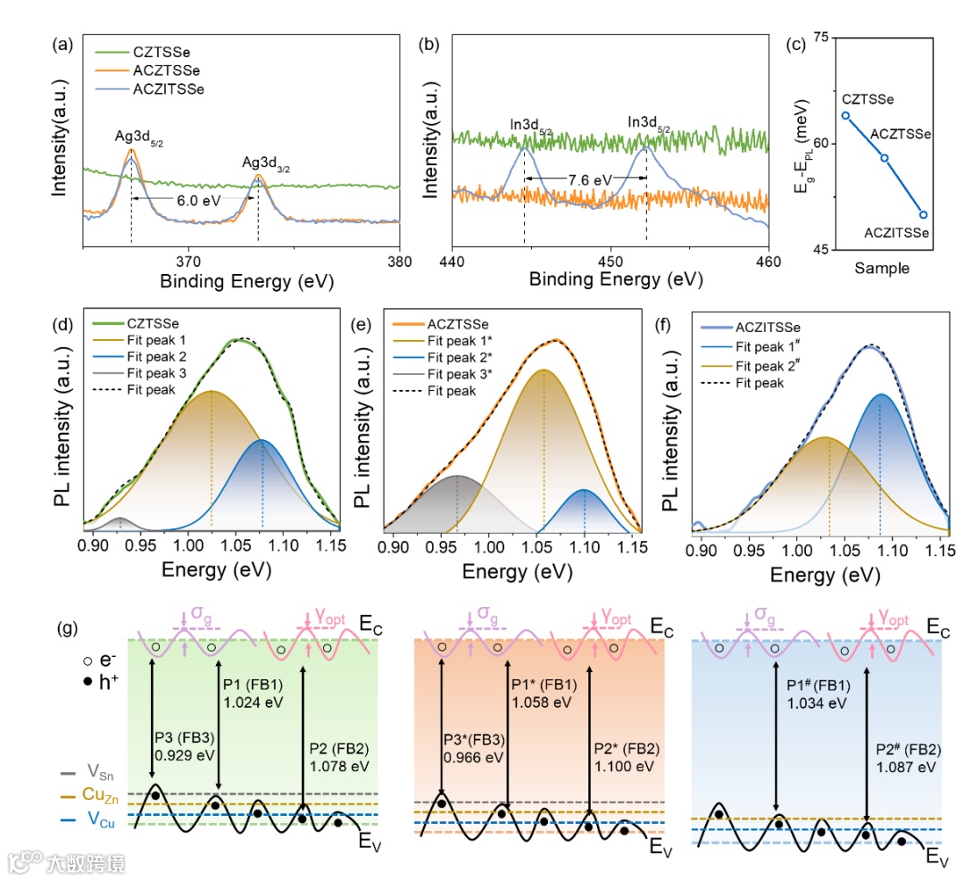 Fig. 4 XPS spectra of a) Ag 3d and b) In 3d core levels of CZTSSe, ACZTSSe and ACZITSSe films. c) The difference between Eg and EPL. The peak-differentiating analysis of the PL spectrum for d) CZTSSe, e) ACZTSSe, f) ACZITSSe films. g) Schematic of the band-edge electronic structure.