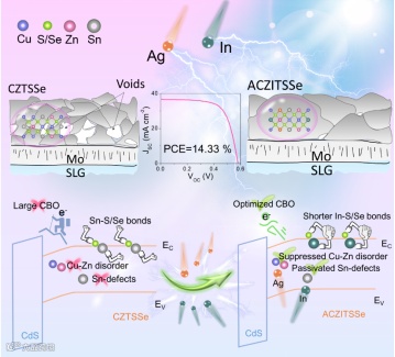 近日,深圳大学梁广兴研究员团队在材料,能源和物理领域顶级学术期刊Advanced Materials上发表题为“Energy Band Alignment and Defect Synergistic Regulation Enable Air-Solution-Processed Kesterite Solar Cells with the Lowest VOC Deficit”的研究论文。该文章提出利用银(Ag)和铟(In)双阳离子协同取代的新策略,同时解决界面能带匹配不理想和高密度有害体缺陷的问题,从而降低载流子复合速率并提高少数载流子寿命。较短的In-S/Se键能够产生比Sn-S/Se键更强的排斥力增大导带最小值,从而改善界面能带匹配。Ag单取代能够有效抑制Cu-Zn无序(ACZTSSe),Ag和In的双重取代进一步钝化了与Sn相关的缺陷(ACZITSSe),同时解决了Ag单取代时载流子浓度较低的问题,从而显著提高了器件的载流子寿命和少数载流子的扩散长度。在大气氛围下通过溶液工艺制备得到了效率为14.33%的CZTSSe太阳能电池,其开路电压(VOC)为580 mV,获得了当前CZTSSe领域中最低的VOC-def值(64.7%)。该研究阐明了双阳离子取代协同调控能带匹配、缺陷能级、晶粒生长和载流子输运的机理,为实现高性能CZTSSe光伏器件提供了一条便捷有效的途径。