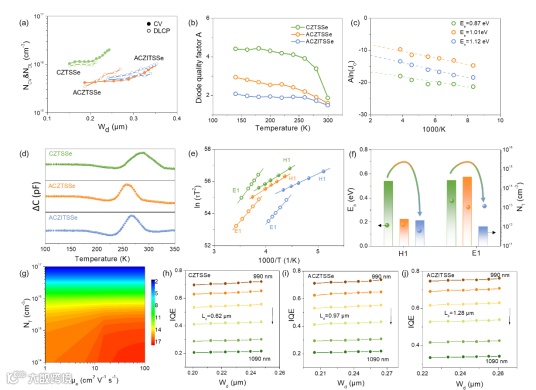 Fig. 5 a) CV and DLCP profiles, b) Temperature dependence of ideal factor, c) Aln(J0) versus 1/kT plot, d) DLTS spectra of CZTSSe, ACZTSSe and ACZITSSe devices. e) The Arrhenius plots derived from DLTS spectra. f) The values of Ea and NT at E1 and H1 defects. g) Defect density versus minority carrier mobility calculated for CZTSSe devices in SCAPS software. h-j) Minority carrier diffusion length extraction of CZTSSe, ACZTSSe and ACZITSSe devices.