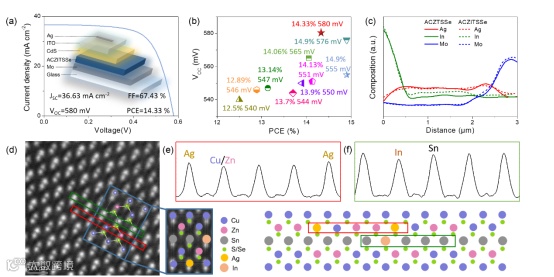 Fig. 1 a) J-V characteristics of the champion ACZITSSe device. b) Comparisons of VOC and PCE of CZTSSe and champion efficiency of this work in kesterite thin film solar cells. c) EDS line scan of ACZTSSe device and ACZITSSe device from CdS to Mo. d) High resolution TEM image of ACZITSSe absorber. The intensity profile in a row of cations is marked by the red rectangle e) and green rectangle f) showing the cation exchange.