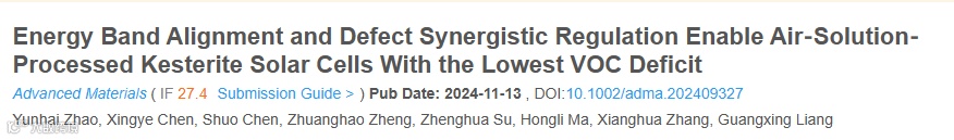 能带匹配和缺陷协同调控获得最低开压亏损的铜锌锡硫硒薄膜太阳电池