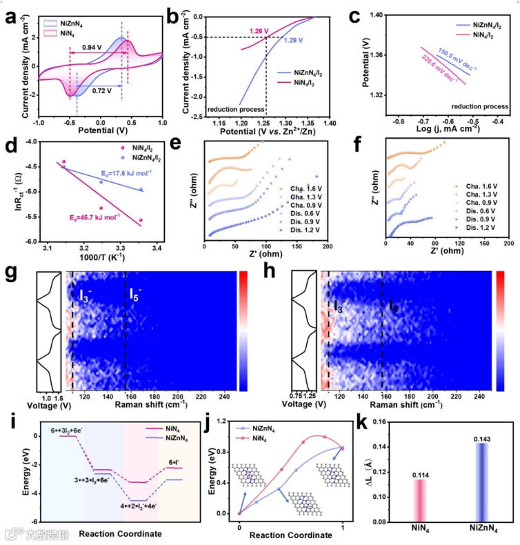 图4 碘转化的催化活性。(a)NiZnN4和NiN4对称电池在0.1 mV s-1下的CV曲线。(b)LSV试验;(c)还原过程中NiZnN4/I2和NiN4/I2电极的塔菲尔斜率。(d)Arrhenius图显示了电荷转移电阻倒数的对数值与绝对温度倒数之间的线性关系。(e)NiN4/I2和(f)NiZnN4/I2的原位EIS测量。使用(g)NiZnN4/I2的Zn-I2电池的原位拉曼轮廓;(h)NiN4/I2阴极。(i)NiZnN4和NiN4上I2还原的吉布斯自由能。(j)不同底物上I3-分解的能量势垒。NiZnN4上的初始、过渡和最终结构(IS、TS、FS)如插图所示。(k)不同底物吸附I2后I-I键键长的变化。