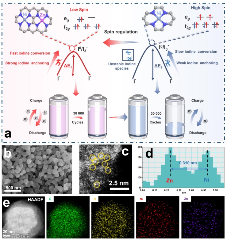 图1 NiZnN4的增强机理和表征。(a)调节镍自旋态构象以增强碘氧化还原化学的示意图。灰色、蓝色、浅蓝色和粉红色的原子分别代表碳、氮、镍和锌原子。(b)SEM图像;(c)HAADF-STEM图像;(d)对应的HAADF强度线扫描;(e)NiZnN4的HAADF-STEM图像和EDS图。