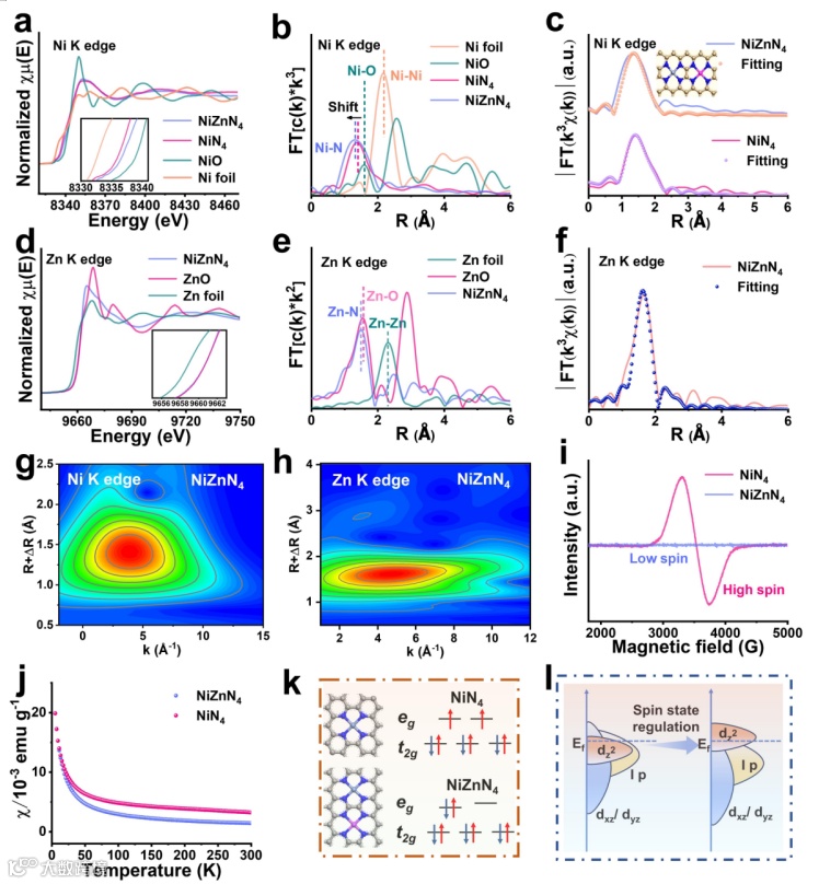 图2 NiZnN4和NiN4电子结构的表征。(a)Ni K边XANES光谱和(b)Ni箔、NiO、NiZnN4和NiN4的相应傅里叶变换(FT)结果。(c)NiZnN4和NiN4的Ni-K边EXAFS拟合曲线。(d)Zn K边XANES光谱和(e)Zn箔、ZnO、NiZnN4的相应傅里叶变换(FT)结果。(f)NiZnN4的Zn K边EXAFS拟合曲线。(g,h)NiZnN4的WT-EXAFS图。(i)EPR谱;(j)温度磁化率曲线。(k)不同自旋态Ni阳离子的3d电子构型。(l)自旋态调节后镍原子能级交换示意图。