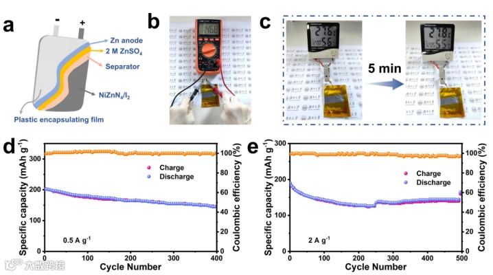 图6 NiZnN4/I2电极的软包电池性能。(a)软包电池内部结构示意图。(b)软包电池的开路电压。(c)为温度和湿度传感器供电的软包电池的数码照片。软包电池在(d)0.5 A g-1下;(e)2.0 A g-1的循环性能。